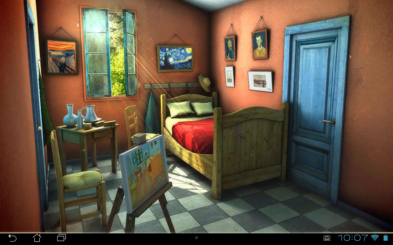 One of the most famous paintings in the world "Bedroom in Arles" of Vincent van Gogh re-created in full 3d will give artistic colorful look to your phone screen! The visual is extremely realistic, so you will feel what you are standing in the middle of the room! This live wallpaper is loaded with great amount of customization options, you can change paintings( most of them by van Gogh), walls, floor or furniture materials. So you can by yourself to design your own van Gogh room, every combination will look just amazing and artistic!