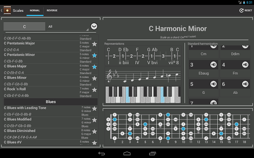 Chords are not all and the app is also shipped with the biggest list of named scales. It analyses and presents them with nice interactive views (scale, score and keyboard). Of course it can also lay down these scales on a neck (with sound). Like for chords, you can even search for a scale from its fingering!
