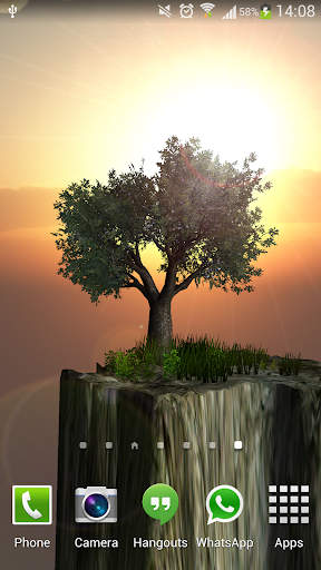 Overview: A lonely tree on the top of a mountain. Magic sparkles slowly rise from the tree up in the air. The tree sways gently in the wind, as does the underlying vegetation. Backdrop is a scenic sunrise, which produces a lens flare as you turn around the tree in 360 degrees with your home screen swipes.